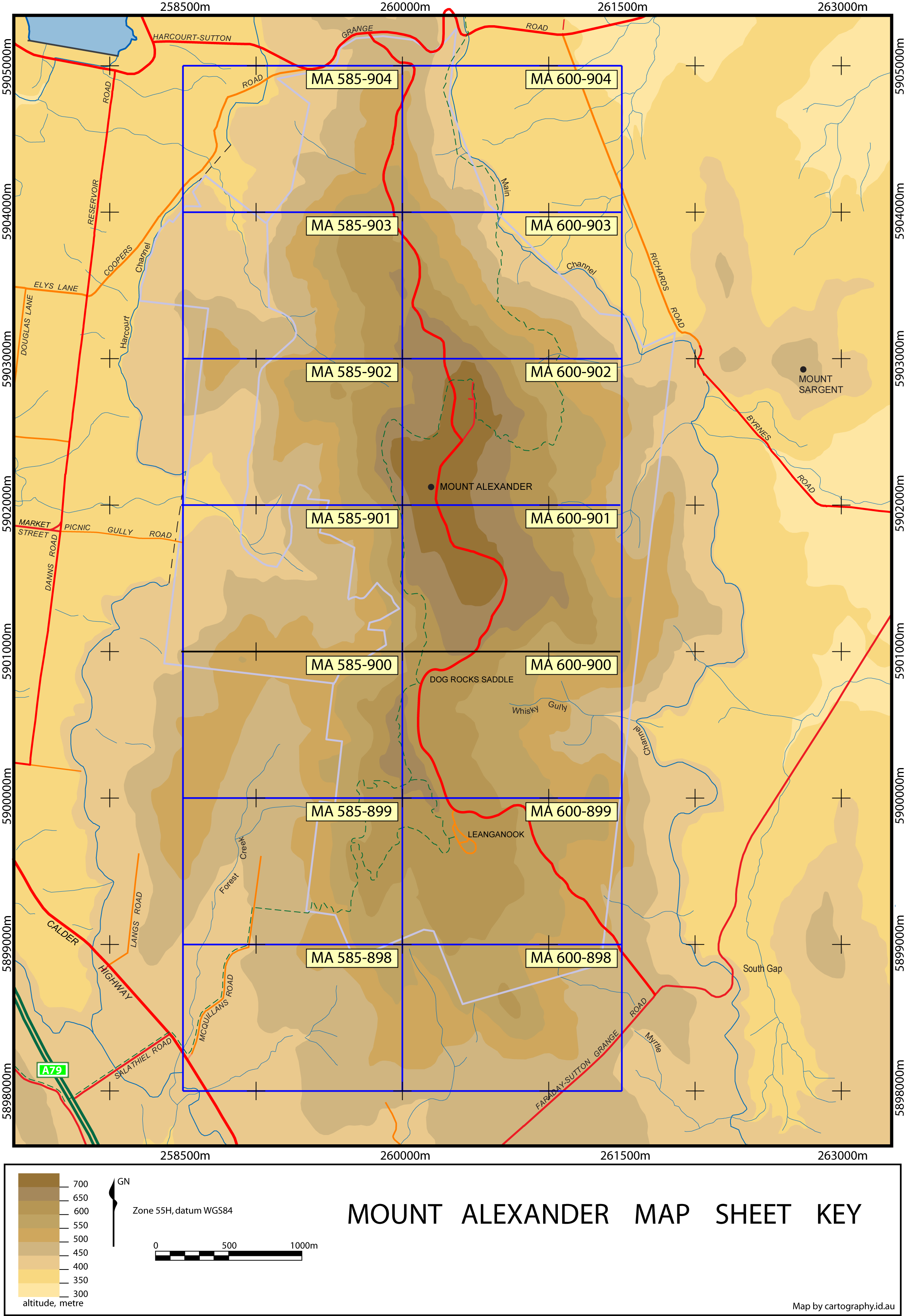 The intended hardcopy format for this topographical map is A3. It is available in two PDF versions: single-sided map only, and double-sided with the map on one side and notes on Mount Alexander on the other. The double-sided version may be folded into a leaflet format. First fold the sheet in half with the text on inside, then fold each 'wing' back (that is, with the map on the inside of the fold) in a concertina fashion.